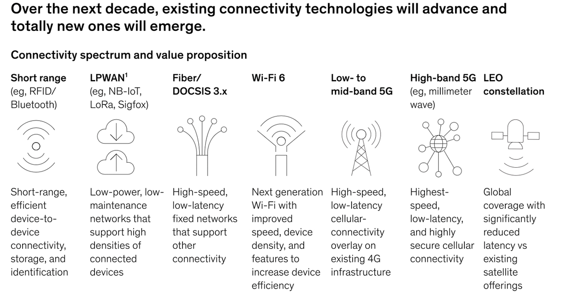 - Massive Internet of Things. Low-power networks and cheaper sensors will set the stage for the IoT to scale up, enabling such use cases as precision irrigation of field crops, monitoring of large herds of livestock, and tracking of the use and performance of remote buildings and large fleets of machinery.