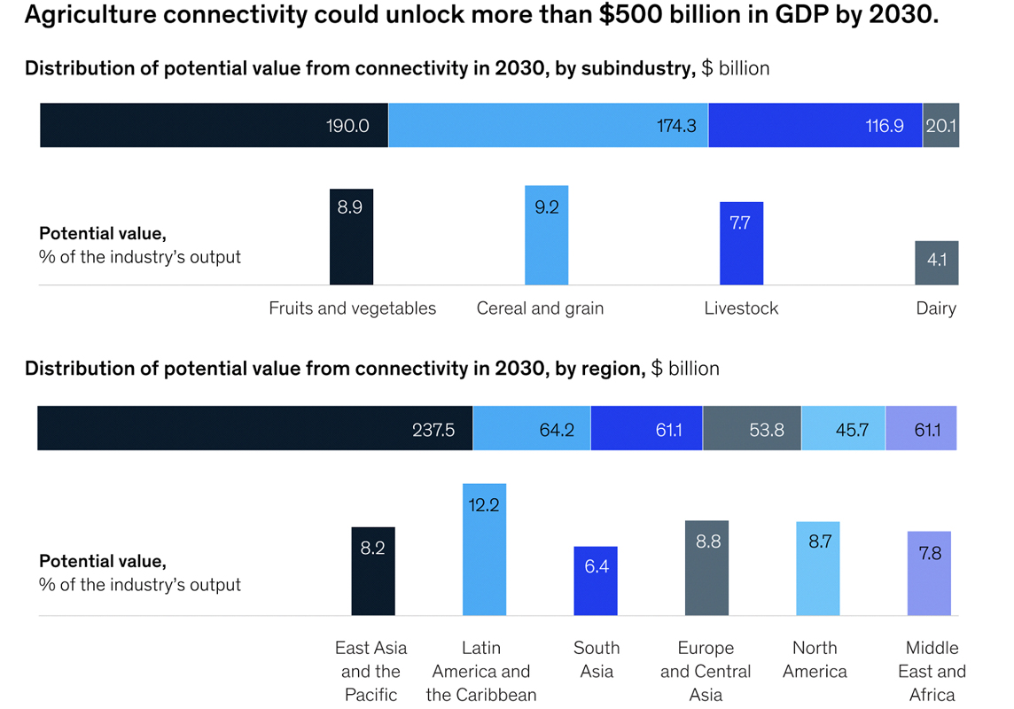 Without a solid connectivity infrastructure, however, none of this is possible. If connectivity is implemented successfully in agriculture, the industry could take on $500 billion in additional value to the global gross domestic product by 2030, according to our research. This would amount to a 7 to 9 percent improvement from its expected total and would alleviate much of the present pressure on farmers. It is one of just seven sectors that, fueled by advanced connectivity, will contribute $2 trillion to $3 trillion in additional value to global GDP over the next decade.
