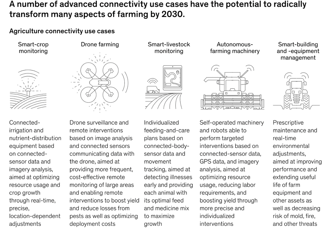 use cases—crop monitoring, livestock monitoring, building and equipment management, drone farming, and autonomous farming machinery—where enhanced connectivity is already in the early stages of being used and is most likely to deliver the higher yields, lower costs, and greater resilience and sustainability that the industry needs to thrive in the 21st century