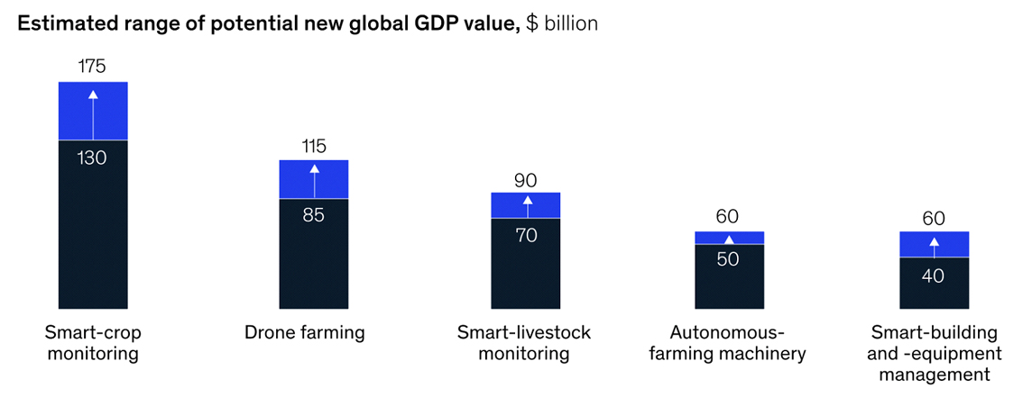 Most IoT networks today cannot support imagery transfer between devices, let alone autonomous imagery analysis, nor can they support high enough device numbers and density to monitor large fields accurately. Narrowband Internet of Things (NB-IoT) and 5G promise to solve these bandwidth and connection-density issues. The use of more and smoother connections between soil, farm equipment, and farm managers could unlock $130 billion to $175 billion in value by 2030.